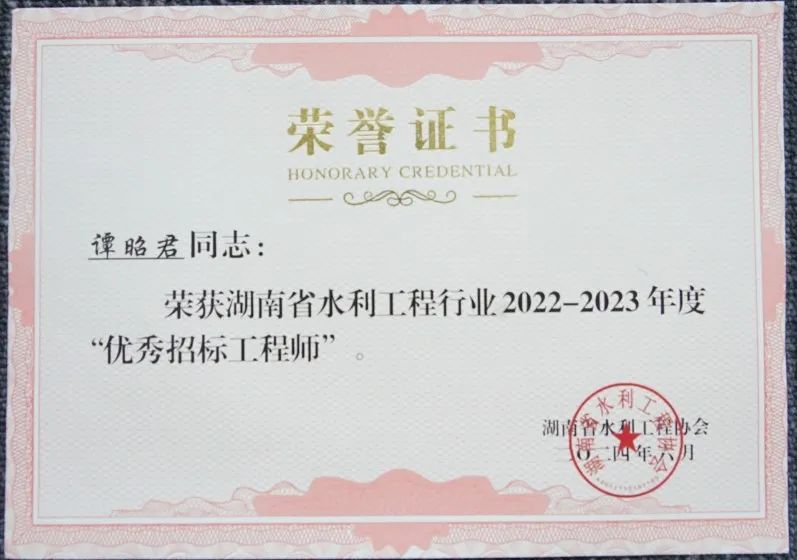 7月8日,在水利工程事業(yè)的浩瀚藍(lán)圖中,我們迎來了一個榮耀的時刻:永信和瑞榮獲湖南省水利工程行業(yè)2022-2023年度優(yōu)秀企業(yè),我司的譚昭君同志榮獲湖南省水利工程行業(yè)2022 -2023年度“優(yōu)秀招標(biāo)工程師”。這份雙重的榮譽(yù),是來自湖南省水利工程協(xié)會的肯定,增強(qiáng)了我們在水利工程方向發(fā)展的信心。